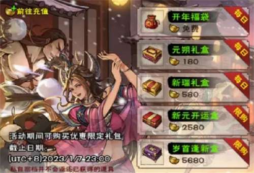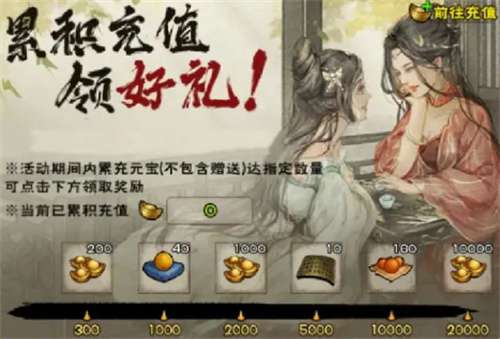 我们将在元旦假期前夕开启累充返利活动,在活动期间,所有玩家累充元宝(不含赠送)达到指定数量后,都可领取相应奖励~