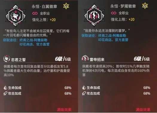 徽章方面白翼徽章更偏向团队续航,而梦魇徽章增加攻速的属性,则可以让皇后更快速地集火秒杀敌人。