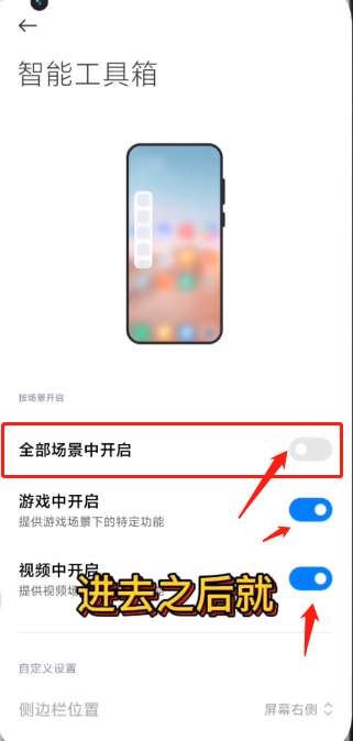 3、最后在智能工具箱中将全部场景中开启右侧按钮关闭即可。想要全部关闭的也可以点击下方游戏中开启和视频中开启进行关闭。