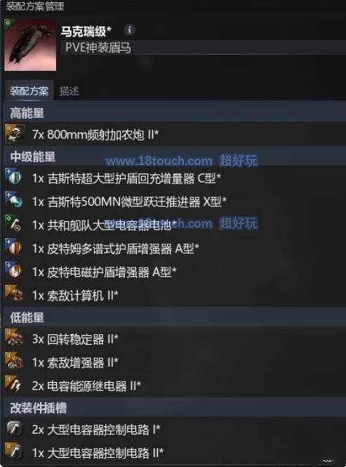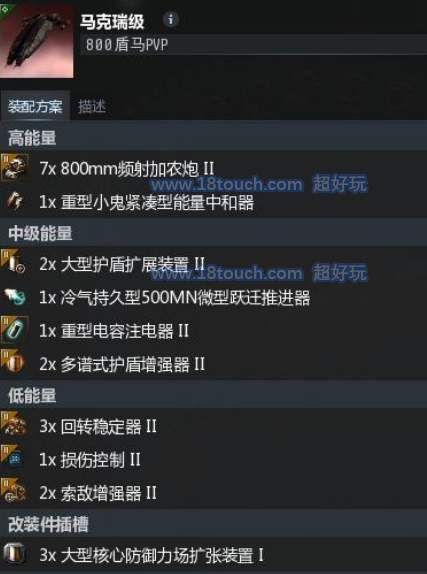 PVP配船方案:马克瑞级的机动性搭配800MM炮火力压制十分强悍,同时还有高额的护盾,高槽搭配重型毁电器可以更好的与敌人进行周旋打击。