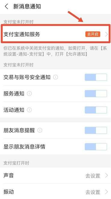 第三步:进入新消息通知界面,点击支付宝通知服务,去开启。