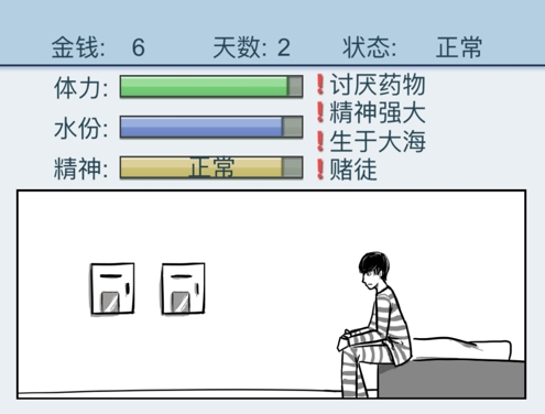 这也是生存游戏,抽卡的同时记得先让自己活下去,因为你的食物,水,可都是抽卡得来的。你还会生病,记得及时治疗。