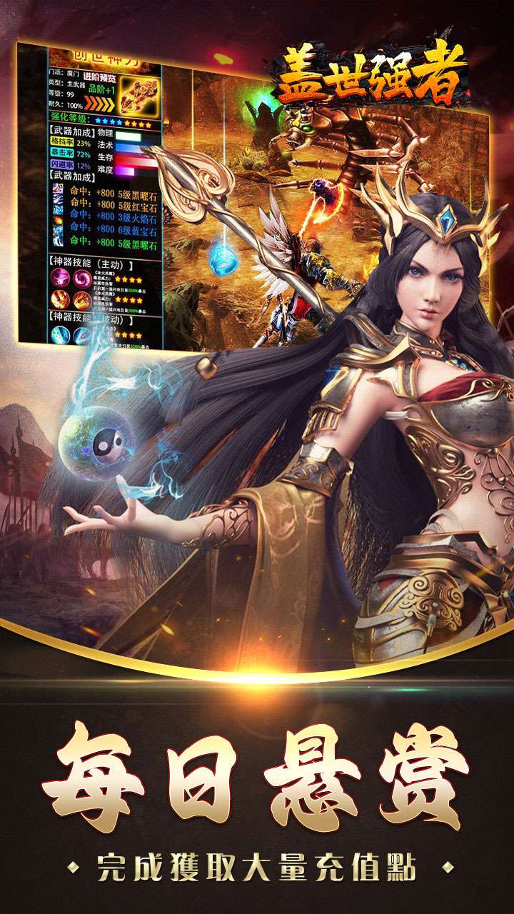 盖世强者(奇遇江湖乱爆)是一款经典微变版本传奇手游!上线即领切割神器、开荒神技!实物宝箱签到送、自动回收免费开!每日悬赏,完成即可获取大量充值点!装备图鉴,收集装备即可提高属性!天赋洗练,各类特色天赋等你探索!特色系统,经典来袭,决战沙城!