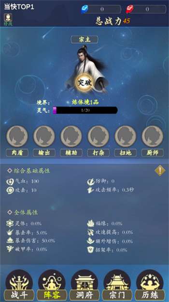 3、【多样职业】有六大职业包括输出、辅助、打杂、扫地、厨师和肉盾,每个职业都有不同技能,互相配合,为宗门贡献力量,根据策略培养强大团队;