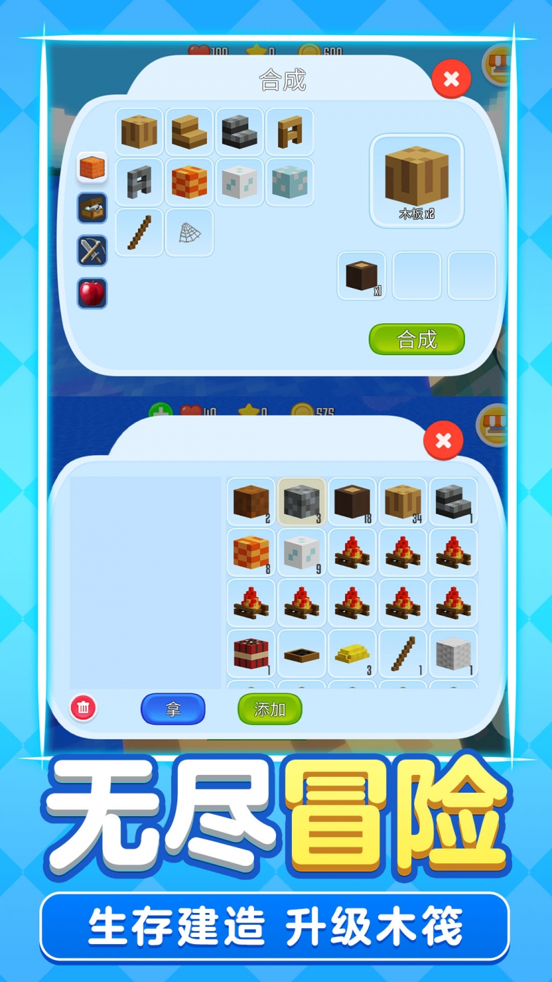 玩家家在进入游戏后,处于一块2×2的小木筏上,除了手里的钩子再无他物。玩家需要收集顺着海水漂浮而来的各种材料,制备必需品,以此确保在海上生存下去。