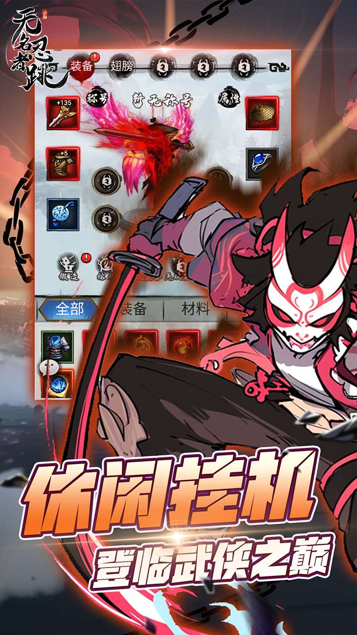 《无名忍者跳》是一款逍遥轻松的武侠放置格斗游戏,简明易懂操作体验,打破传统硬派动作武侠的刀光剑影,风风雨雨江湖武林;这里有数十个被动技能,十二个主动技能,打怪之前随心搭配!二十多个关卡技能,关卡之中随心猎取强化,一刀会心秒怪,一键贯穿清屏,或是剑气绕身、死而复生、刀枪不入,全部不在话下!上百种酷炫装备,打怪就掉放置更能掉,随心获取随意搭配。一樽酒,一把剑,悠哉御剑江湖载酒行,江湖邋遢不知名,你又将谱写一段怎样的侠客人生,让你能够邂逅全新的江湖奇遇,体验多元的江湖人生。