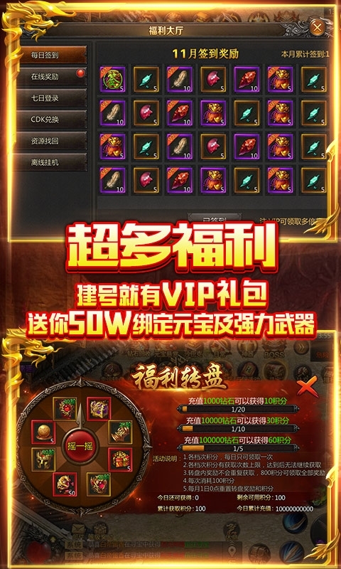 2、特色福利一:海量元宝等你来拿,建号就有VIP礼包,送你50W绑定元宝及强力武器,助你开启热血征程。