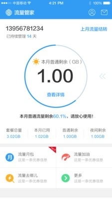 移动流量管家app是一款生活服务应用,是中国移动通信集团浙江有限公司打造的移动服务平台。移动流量管家app可为你充值话费、监控流量,以及办理业务等,是你的移动流量管家。