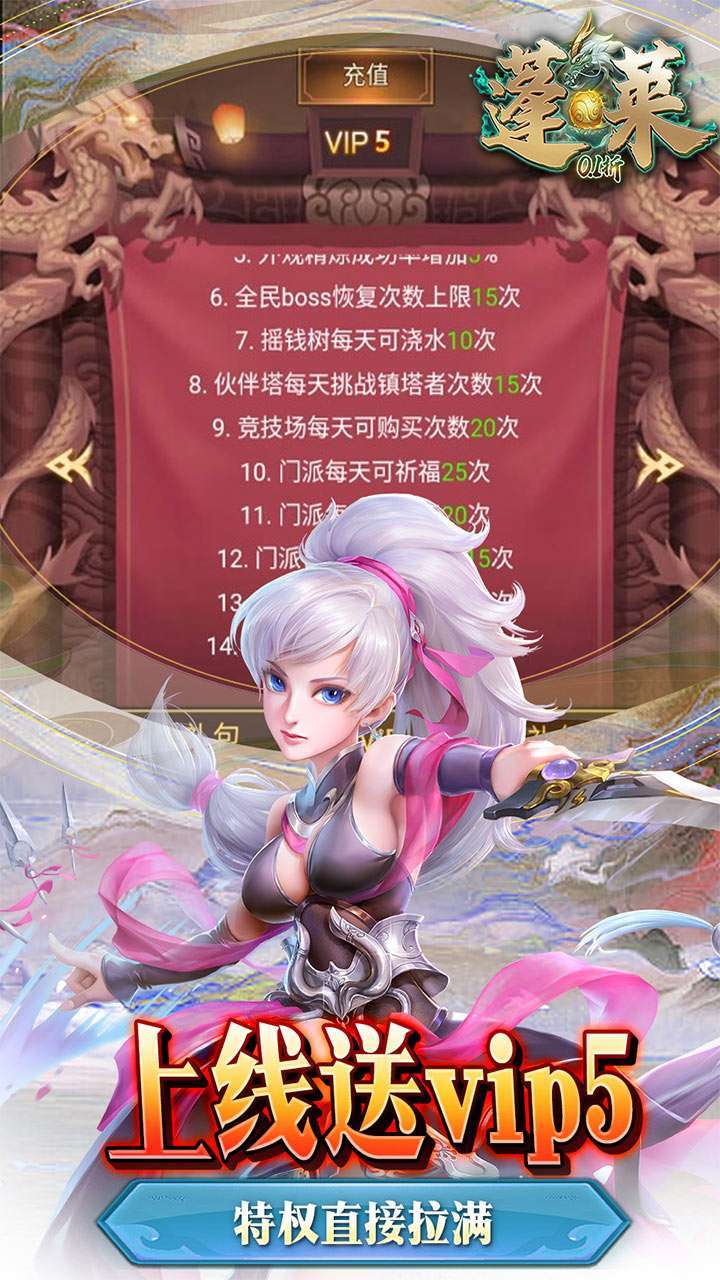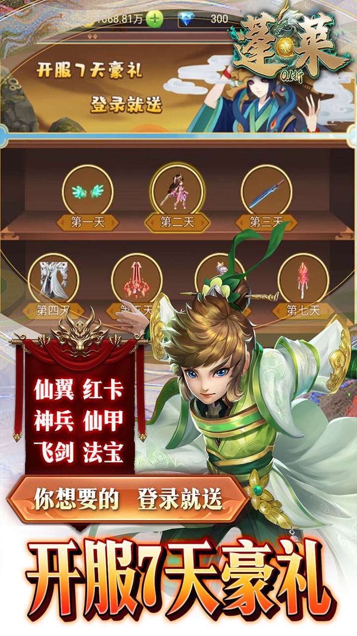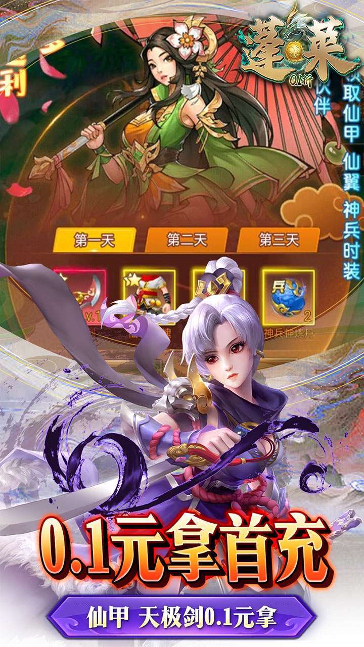 《蓬莱(首续0.1折)》策划承诺,全场真实充值0.1折,遨游三界仙侠游戏界面使用仙侠背景元素,游戏中加入经典收集仙侠系统、仙侣系统及伙伴系统,玩法多变。开服7天豪礼,仙翼、红卡,神兵,仙甲,飞剑,法宝,你想要的,登录就送,0.1元拿首充,仙甲,天极剑0.1元拿。