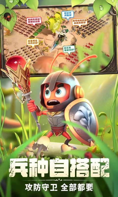 造蚂蚁王国,与何止百万玩家斗智斗勇,招蚁族豪将,丰富阵营赢下战争! 在《蚁族崛起》你将作为蚁族统帅,建造你的专属蚂蚁王国。神机妙算的三国英雄、智勇双全的凯撒,还有数位出类拔萃的豪将,都等待你招募入队,成为蚁族中坚!通过资源囤积、城防修建、战力提升,将一方蚁穴壮大成为兵「蚁」强壮的王国城邦!与百万玩家结盟或是为敌,抵御强敌进攻,联手攻克城池,战无不胜,攻无不取,成为地下世界的霸主! 与此同时,游戏还采用技术前沿的引擎开发,呈现高品质的画面。画面还原蚂蚁与战争细节,玩家可以尽情感受微观世界的对决乐趣,在神奇的蚂蚁世界中招兵征战。