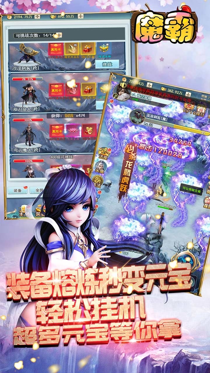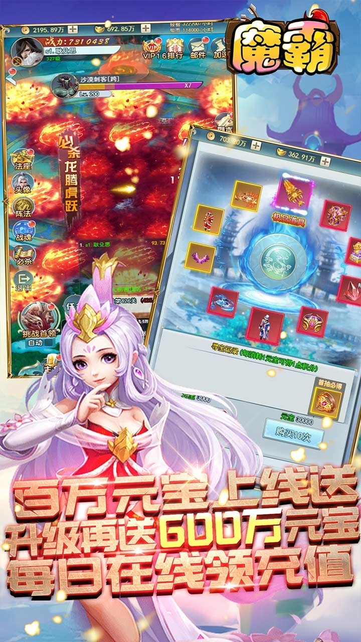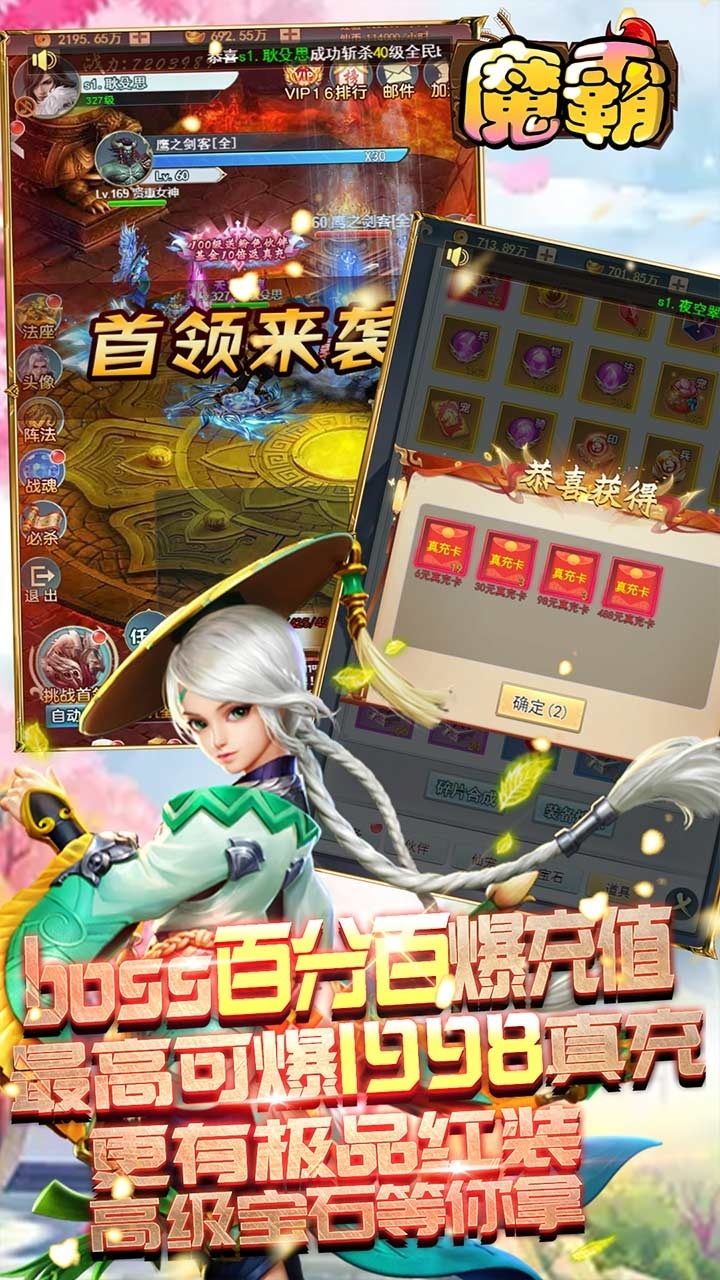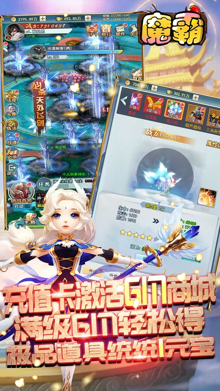 魔霸(GM无限送充值)是一款仙侠类风格的大型多人在线角色扮演类游戏。上线就送百万元宝、VIP13、888W金币。此外,游戏内还赠送了大量充值卡,可以激活GM商城,GM商城所有道具均一元宝购买。挑战boss最高可爆998元真充卡。每日挂机即可得元宝,回收熔炼装备即可将不用的装备回收为元宝,1秒到账,极致体验。同时还可以自由搭配游戏时装,打扮最萌系,最好看的仙侠人物。另外独创了伙伴,修仙,神器等系统給玩家更强的代入感!同时游戏中有丰富玩法御剑飞行,神器,可爱的萌宠,华丽翅膀,精美的坐骑等多样玩法。给玩家一种完美的修仙体验。