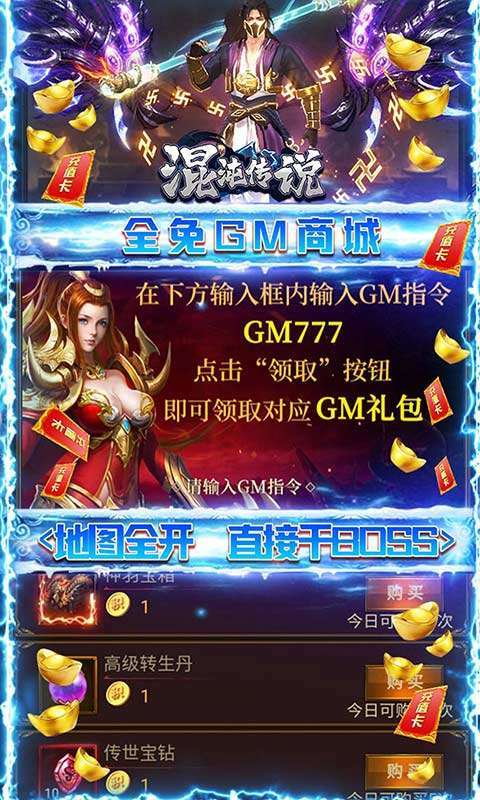 混沌传说(GM无限元宝)携最强GM无限元宝版本福利华丽归来! 上线送百万元宝、热血神器,无限福利每日壕领不停!上线激活gm特权,快速开启gm商城,绝版时装海量材料无限领取!BOSS爆率全部上调1000%,无限爆真充,福利拉满在线打金!每日领取gm指令,无限领取金币元宝真充卡!击杀boss可以获得大量直充币,直充币可替代RMB去指定充值进行充值,充值可激活每日累充活动!快邀请兄弟齐聚沙城,称霸全服!