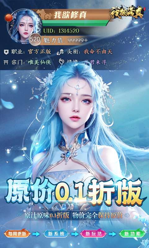 【创角即送】霸气外观:金坐麒麟、千年神鲲、灵光神鹿、炼狱噬魂衣、五条悟,1000元充值卷、进阶丹随机礼包*2000 【开服送礼】12个头像框 11个气泡框,丹药990 宝石990 进阶礼包9990 元宝88888 6480灵玉卡 扩展行囊*250 【策划承诺】游戏内所有充值通通0.1折,原汁原味0.1版本,物价完全保持原价,原几千元神藏套装仅需几十元 【每日千元】日常活跃可免费领取“1000元充值卷(每日免费获取)” 1比1还原真实充值 【秒杀快感】新增BOSS秒杀功能,真正体验刚出刀BOSS就挂了的爽感 【版本更新】版本持续迭代,每周必更:新功能、新玩法、新系统 【每日签到】每天可以领取百元“充值卷”1比1还原真实充值 【神魔系统】一念成神,一念成魔,我命由我不由天,任君选择 【魔王boss】刷BOSS无限白嫖高级幻化套装 绝不花1分钱 【七日登录】送多种外观,免费领取“2000元充值卷” 【官方正版】顶级巨作官方正版唯美仙侠手游