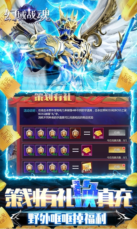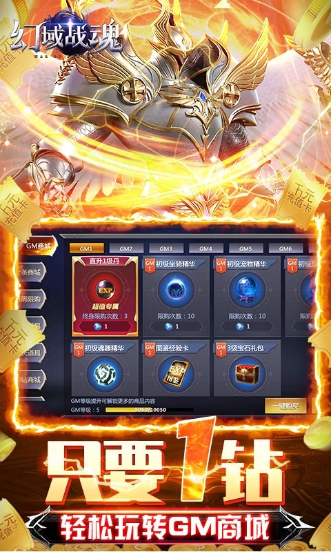 2021年福利手游《幻域战魂-GM无限资源》首日在线即可领取10000元真充卡,无门槛使用,100万紫钻石,1亿金币,享受白嫖福利的快感,除此之外还有免费GM装备套,真充卡能激活首充奖励,免费送神权GM特权,集字换真充,签到福利等!超多福利等您来体验!游戏背景设定在圣言之战结束后,大天使不知所踪,魔族为了复活被封印的魔王,不断向人族发起战争;由于种族间的力量差异,人族节节败退,为了人族的未来,教会发动了大天使传承下来的秘术,您将化身为人族勇士,继承大天使意志的勇者,在战斗中锤炼自己,化身大天使勇斗魔神!