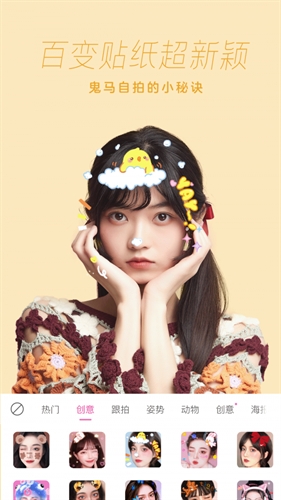 2.各种搞趣动态贴纸智能人脸识别,长按拍照键还可录制短视频