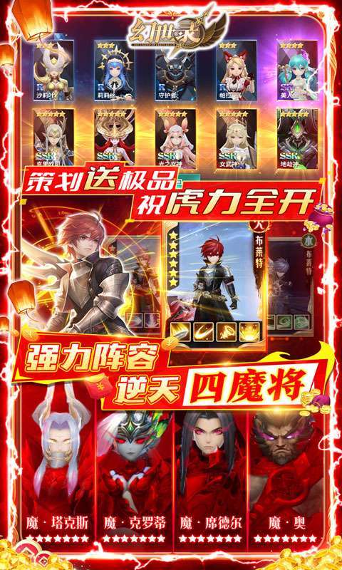 后缀说明:集卡点亮图鉴可领取10000元充值卡奖励;主线成就赠送SSR英雄;创角赠送四魔将,开局即可拥有超强阵容