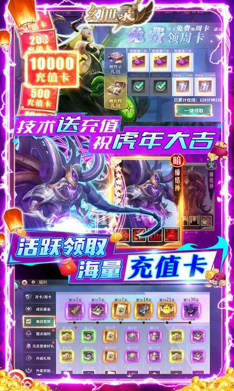 2、收集图鉴领取10000元充值卡;完成活跃赠送200元充值卡;推图赠送海量红水晶、大量高级招募券