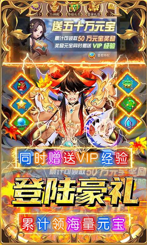 元宝*2888、挂机令*68、幸运币*68、银两*20w(输入礼包码GMCJFL888获取上线福利)