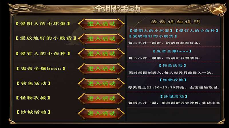 1、随机触发各个地图,地图大,怪物多,爆率高,难度较高!收益高!风险大!