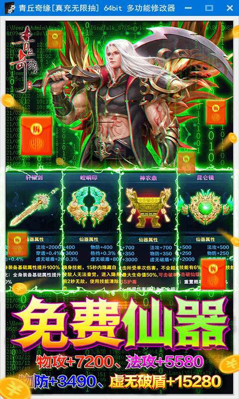 8.免费仙器:昆仑镜-几率击破BOSS护盾、神农鼎:单次免伤50%、崆峒印-可隐身无敌、轩辕剑-装备属性提升100%