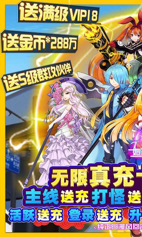 1、上线送vip18,蓝钻*98888,红钻*98888,金币*288万,S级伙伴、S级萌宠