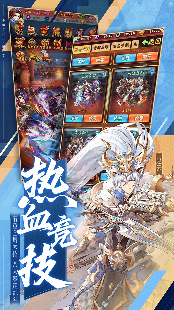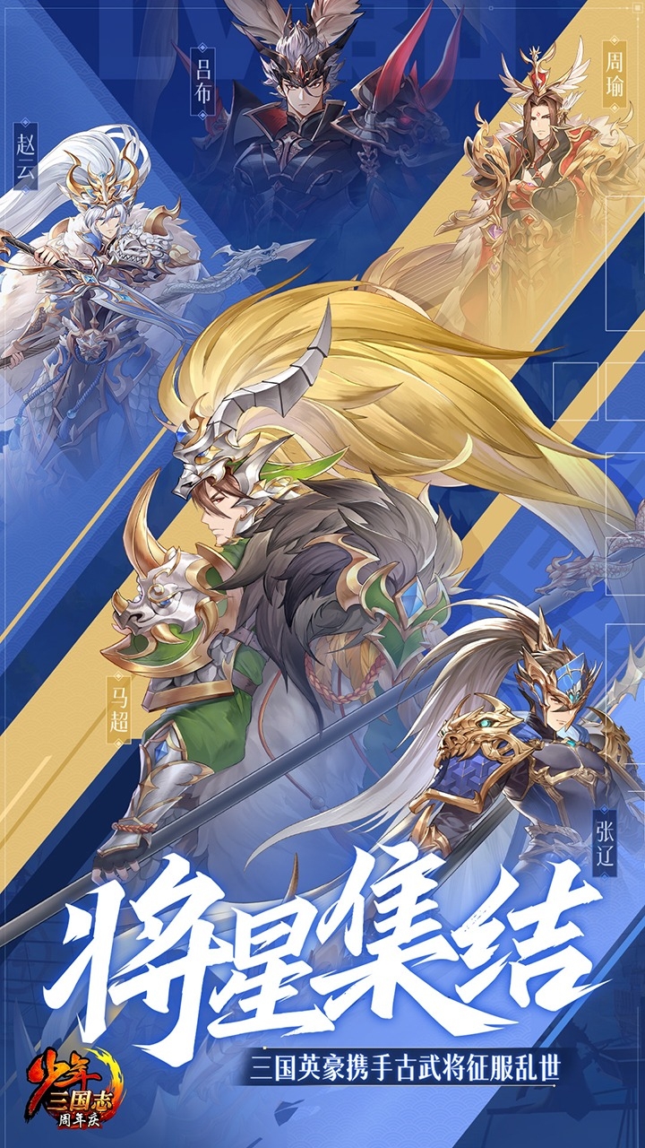 少年三国志是一款以超爽合击技,酷炫战斗为主打的立体卡牌手游,玩法突破了传统卡牌的人物羁绊,以最直接的武将合体大招,配合流畅的连击特效享受啪啪啪的破敌快感。游戏让你置身少年,赋予每个人一张16岁的脸,摒弃了旧三国的尔虞我诈和英雄迟暮,展现生命中最辉煌灿烂的一面!细腻独特的武将配音,栩栩如生的动态场景带你重回那个荡气回肠的乱世,不为天下苍生,不为夺取江山,只为做三国最强的人,这是你的时代。
