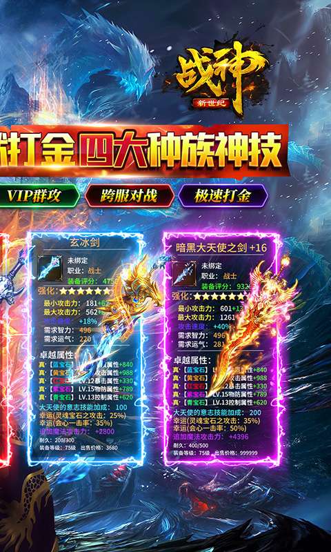 ★上线福利,自动回收、自动拾取、免费狂暴之力!!! ★新服福利,免费首充、专属时装!!! ★四大种族,专属技能完成任务免费领取!!! ★VIP群攻,挂机打怪免费激活!!!