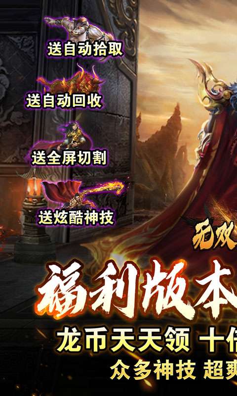 1、上线就送:自动拾物,自动回收,超大背包和三页仓库! 2、七天扶持:送大量真实充值,不充钱也能体验充钱快感! 3、在线奖励:每天上线可以领取大量材料跟充值货币! 4、每日杀怪:送大量充值红包+VIP积分,VIP免费送! 5、每个地图都有福利BOSS跟超级BOSS,真实充值跟货币大量爆,每天随便白嫖上千元充值! 6、超爽跨服玩法,1V1激情PK
