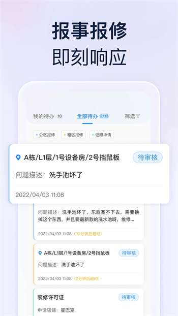 提供了全面的工单管理功能,包括派单、回单和审核等等实用环节,实现了物业工作流程的全面协调管理;