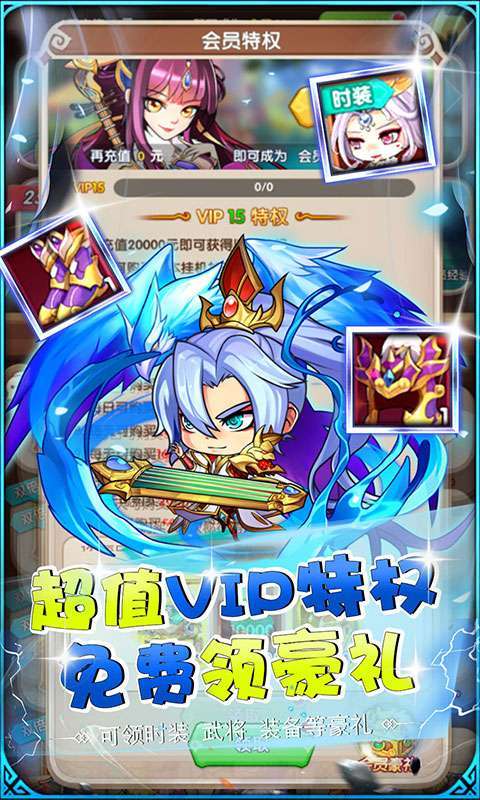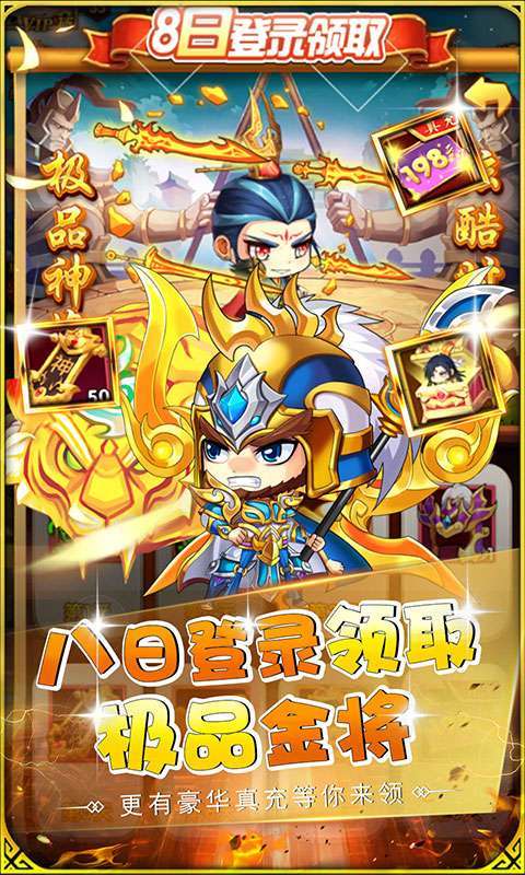 萌斗魏蜀吴(送真充金将狂欢)《萌斗魏蜀吴》是一款三国题材的乱斗放置挂机游戏。众多熟知的三国英雄们都将一一登场,开启一段崭新的冒险,另类的剧情设定,夸张的技能释放,多种新奇玩法,带来不一样的游戏体验!