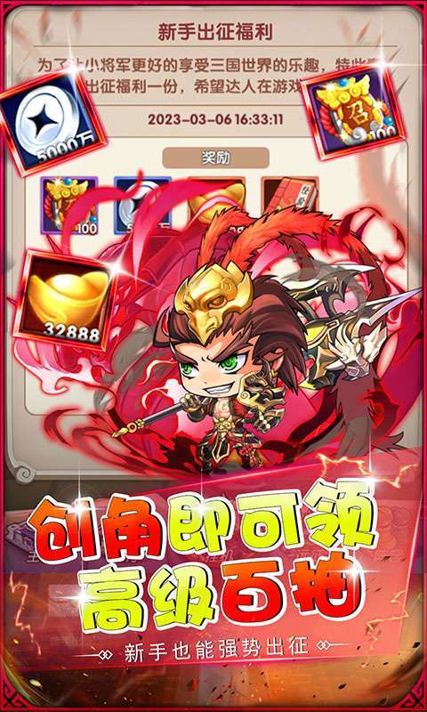 金色武將萬能碎片*100、紅裝選擇箱*3、突破石*1500、中級武將精華*800、裝備魔晶*60、圖鑒卷軸*300
