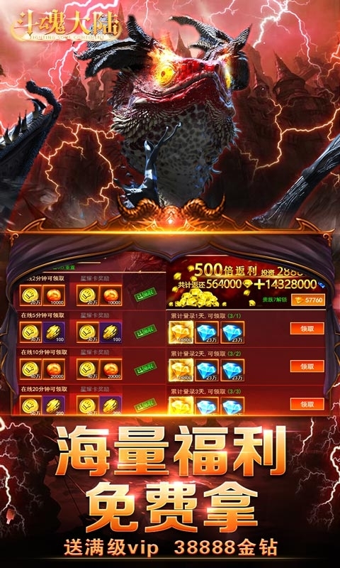 上线赠送满级vip,38888金钻,黄金2千万,千元充值卡
