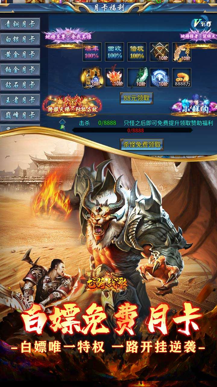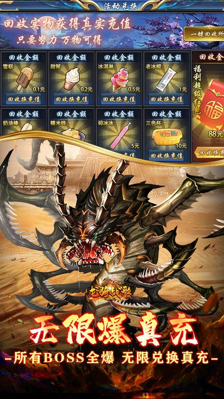 月卡全免费!BOSS进化爆终极!良心绿色主打超低消费!!打小怪就就能变异到终极怪,所有BOSS必爆充值,与自身充值一模一样,本服除了58元为硬性消费,无其他硬性消费和暗坑!免费月卡打怪即可免费白嫖!虽然免费,但都很实用!超值豪礼+冠名只要愿意肝,一周左右也可全部免费获得!我们只做低消费,绝不打着免费的幌子做暗坑!保证免费玩家能玩!能通关!一切全爆,一切全看脸!!!