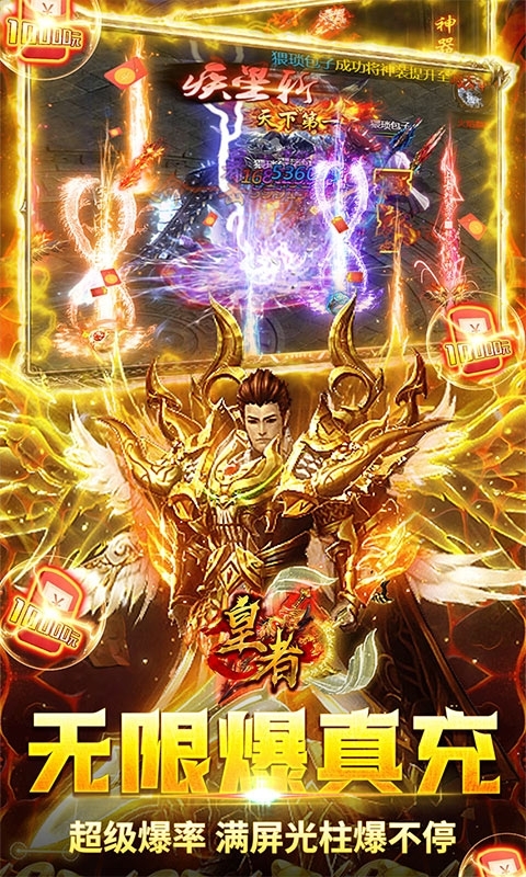 深受百万传奇玩家喜爱的人气手游皇者(终身返真充)携第四职业---“魔神”荣耀归来! 上线免费领取vip15,百万元宝,绝版武圣战神时装套!全新地图、全新福利、全新第四职业专属切割技能,刀刀切割无视防御!全新GM特权,应有尽有!无限每日送真充,绝版时装、元宝、极品装备材料全部免费无限送!福利全新升级,千倍投资,永久年卡超值豪礼领不听!快唤回曾经的兄弟们一起战斗吧!荣耀归来,再创传奇!