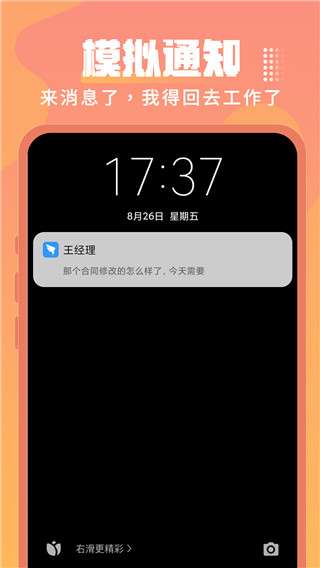 2、允许用户自定义消息内容,可以根据具体情况编写适当的借口,使模拟消息更加真实可信。这样,用户可以更好地应对各种尴尬场面,让逃离变得更加顺利。