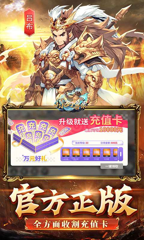 1.官方正版0.1折三国卡牌,全场充值0.1折,绝无数值膨胀! 2.创角登录即送神吕布、贵族6、专属头像框、海量成长资源! 3.超爽打金每日完成活跃免费送充值卡,每日刷新无限领取! 4.升级免费送万元充值卡,免费得海量元宝与激活累充进度! 5.挂机即可获得海量成长资源,上线高福利,稳定高连抽! 6.内置休闲挂机系统,解放双手,全身心沉浸在卡牌体验中!