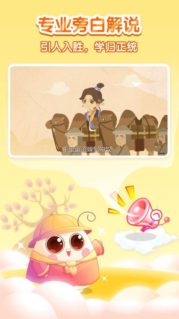 课程在播放动画视频的同时,配以专业的旁白解说语音。形象生动,娓娓道来,给孩子传授专业的历史知识,启发孩子的智慧。同时,通过语音,引导孩子独立思考,判定故事中的是非对错,潜移默化地塑造孩子正向的历史格局和价值观。