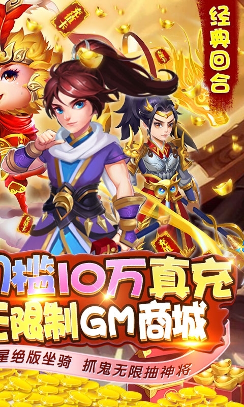 【第十重】 登录送圣兽——神宠、高书、充值卡全都有 《悟空修仙传-送十万真充》是一款西游题材的回合制巨制手游。 懂回合才能做好回合。回合制玩家喜欢的福利我们全都送! 福利:真充卡、神宠、高书、高宝、特权,抽奖、无级别等等。 玩法:抓鬼爆真充,任务爆高书!力求打造原汁原味的玩法+爽到爆炸的福利。