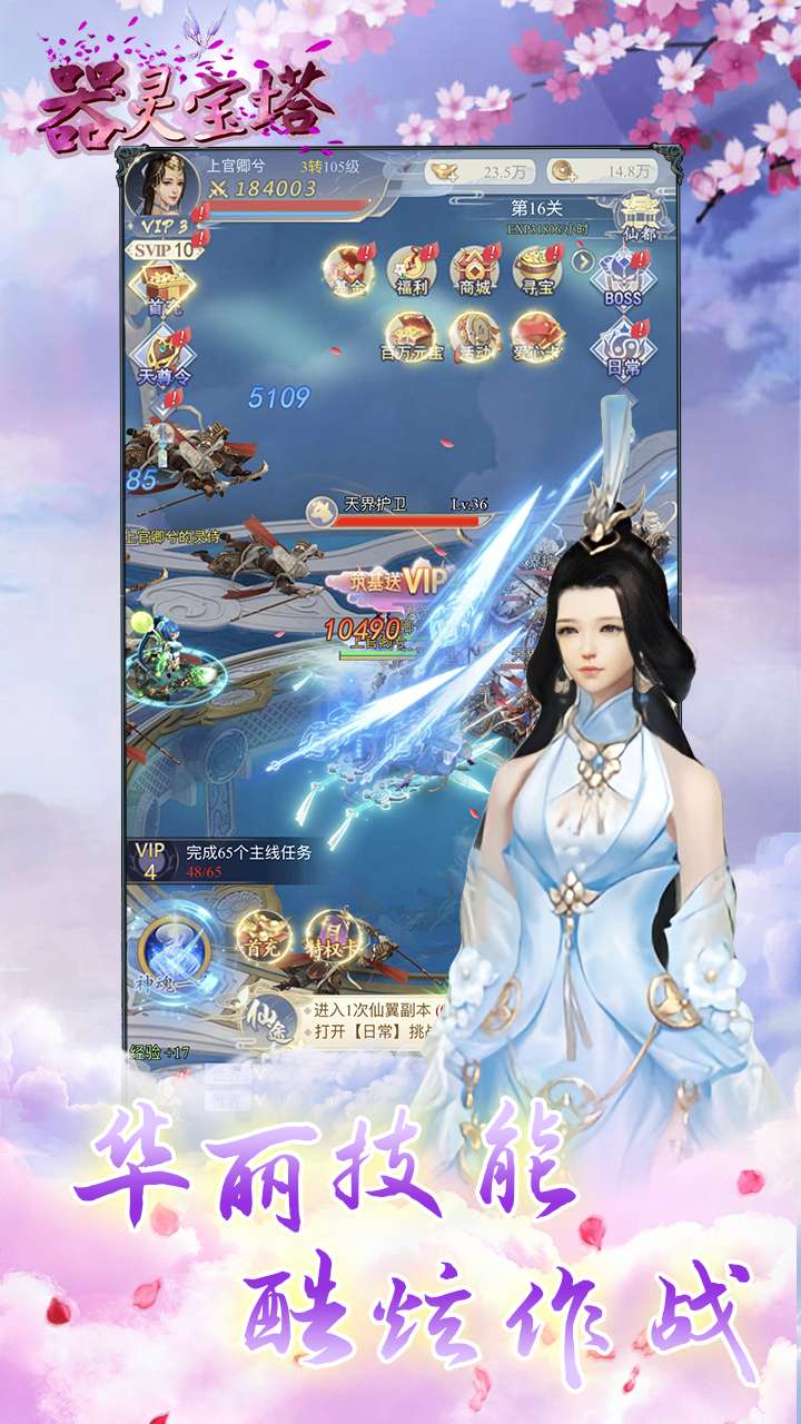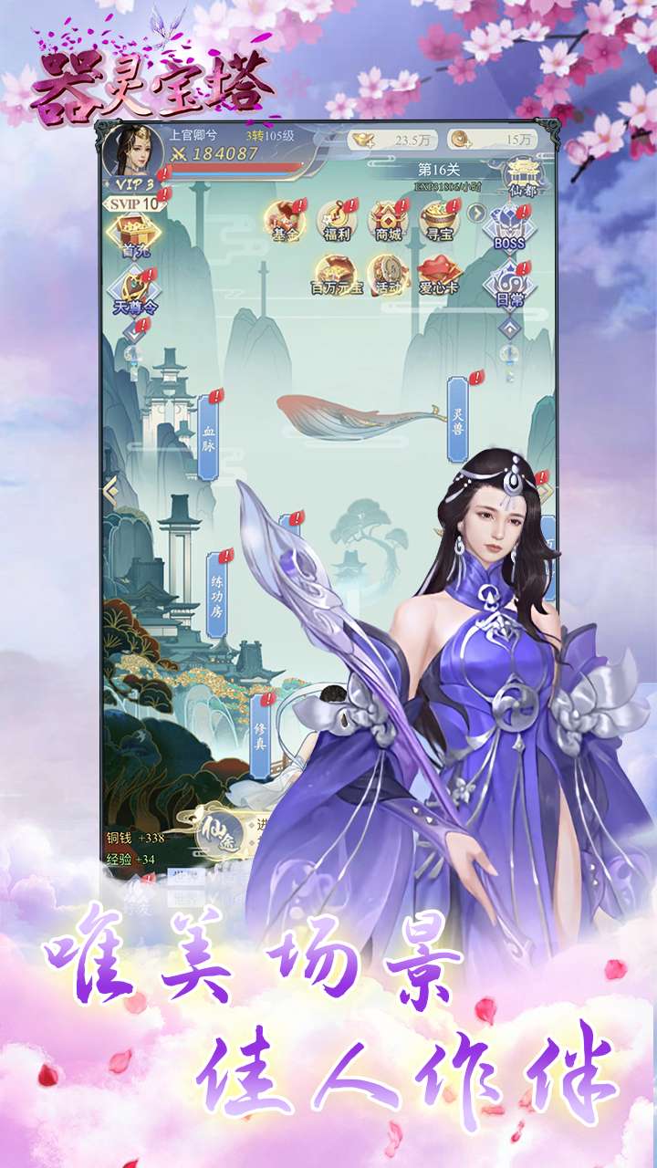 《器灵宝塔(妙法仙魔)》是一款挂机类国风修仙RPG手游,画风精美、剧情动人、玩法丰富。玩家扮演的主角身负重任,只有渡劫转生,不断提高自身战力,才能通过幻境中重重历练。最终挽救隐仙界于将崩之时。