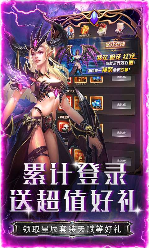 上线福利:vip8、500w金币、188888钻石、伙伴·朵朵*1 1.创角即送品质6神级伙伴-席丽斯,一起战斗推图无忧!(邮件领取) 2.上线即送满vip8,vip奖励免费领! 3.7日登录领极品神装! 4.累登送星辰套装、羽翼、天赋、钻石等好礼! 5.冲级图鉴、武器送不停,战力飞升仅在一瞬间!
