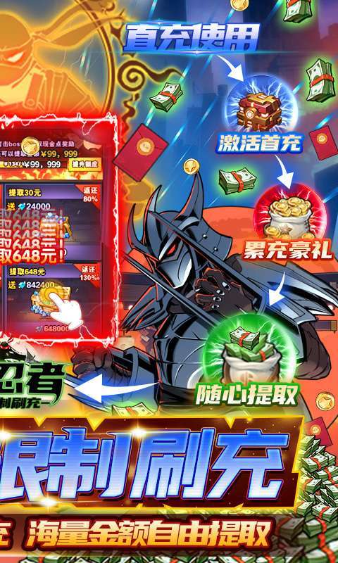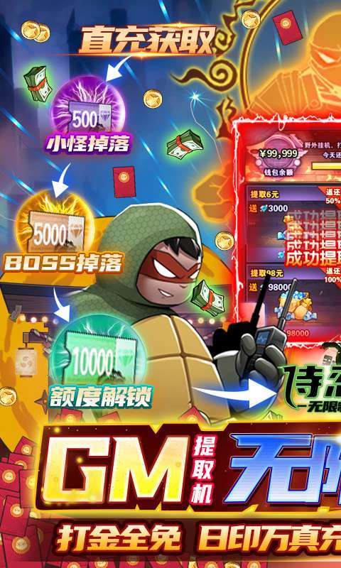 游戏简介:上线就送GM提取机,1W元真充卡,不花钱也成神!打金永无止境,忍者神龟手游巨作《侍忍者-无限制刷充》强势来袭,超清画质,特色系统,多样玩法,海量装备给你前所未有的刺激体验。击杀BOSS以及挂机无限掉直充卡,0氪畅玩不是梦!创角直升满V,天天送真充,直充特权免费拿!免费首充即送炫酷时装和超强BUFF,史诗装备等!还有全新活动,新增各种神级伙伴等着你!!