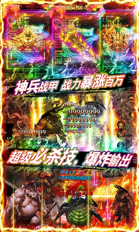 游戏特色一、上线2分钟直接打BOSS,百倍爆率,神装爆满屏;