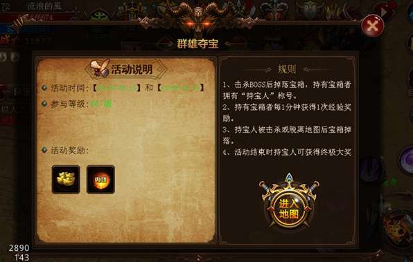 群雄夺宝活动每天两次,活动开始后,地图会出现一个BOSS,杀掉BOSS会爆一个宝箱,拿到宝箱的玩家每分钟都会获得随机奖励,活动结束后,获得宝箱的玩家打开宝箱会有很大几率获得100元宝,我们之前开宝箱,10次有9次都是元宝,开不到元宝的都是手黑的,拖出去打屁屁。。。。