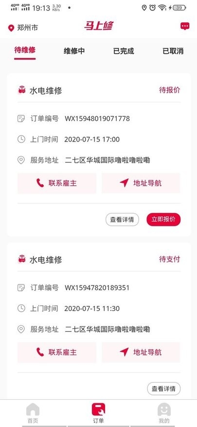 3、自动保存接单记录,并按照待维修、维修中、已完成等状态进行分类展示;