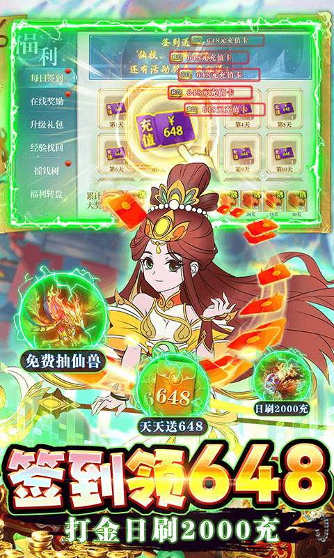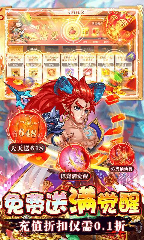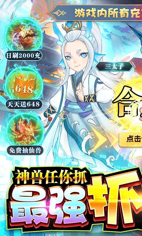 ★上线就送VIP7、88w元宝、1000w银两、1000充值点 ★天天登录领648,每日在线送328 ★GM工具每天保底打金2000元,海量充值免费激活 ★所有神兽任你抓,无需充值也能轻轻松松升至满觉醒 ★升级送万元充值 ★充值比例1:1000(仙玉)