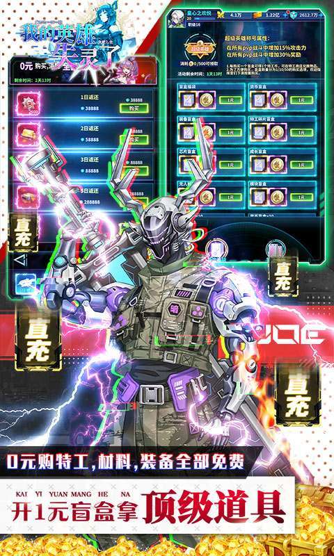 【特工盲盒】:英雄商城1元盲盒,以小博大,1元即有机会获得最顶级道具,参与活动还可领取超级英雄称号,0元购礼包返还全部消耗,特工、材料、装备全部统统免费!