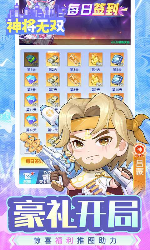 ★游戏充值永久0.05折,不限量不膨胀! ★开局直送SSR英雄与专属神兵豪礼! ★上线即送千抽福利,顶级红将轻松白嫖! ★二十万真充红包全新升级,通关免费送! ★七日登录豪礼送不停,红色人才等你领! ★内置无限充值系统,每日活跃即可白嫖真充,拉满额度迅速提升! ★超级赞助系统,打金福利转盘,免氪纯享百万钻石、无限寻宝抽不停! ★多重玩法合集,精英竞技、pk挑战,轻松畅玩度过闲暇时光!
