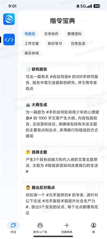 360智脑是一款功能强大的AI对话软件,提供了多个领域的AI数字人角色,包括小说人物、科学家、历史人物等等,通过与这些数字人进行实时对话,可以获得各种帮助延伸智慧的机会,帮助写文案报告。无论是商业文案还是学术报告,只需向数字人提出需求,就会根据要求提供相关的写作建议指导,这样不仅可以节省时间,还可以获得高质量的文案报告。其次可以回答问题,无论是日常生活中的琐事还是专业领域中的难题,只需向数字人提问,会尽力给出准确有用的答案这,这提供了一个便捷的知识获取渠道,帮助解决困惑提高学习效率。