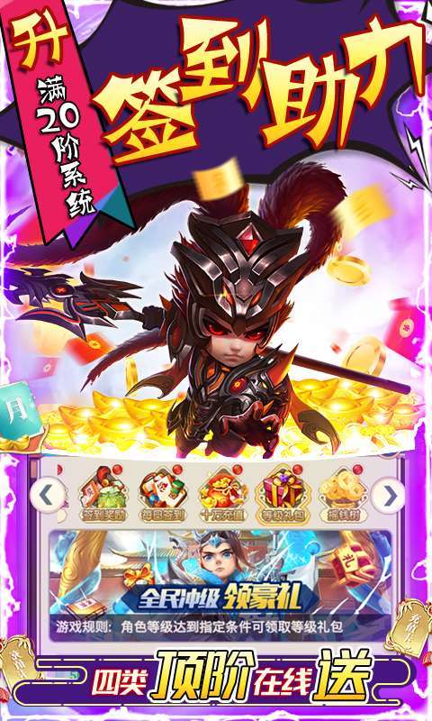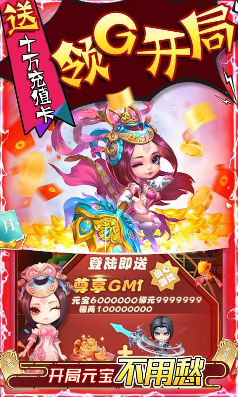 全新三国游戏,全GM十万充版本火爆上线,登陆尊享GM特权全白送,海量福利创角立马安排,十万充值卡无门槛使用壕无人性。在线福利满满,稀有三国红色武将全部送,四大系统免费领满阶,稀有道具海量送,助你过关斩将,战力暴涨。还在等什么,一起来征战三国!