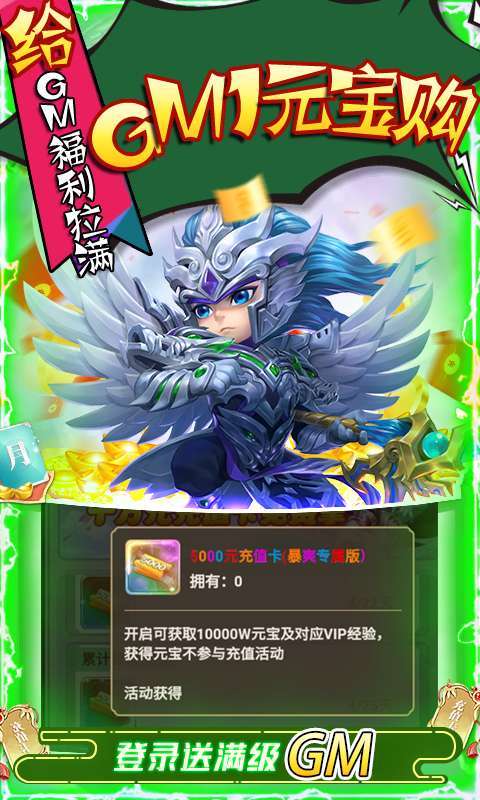 2.上线送超级特权GM1,连续登陆送至GM14,GM商城稀有道具1元宝购!